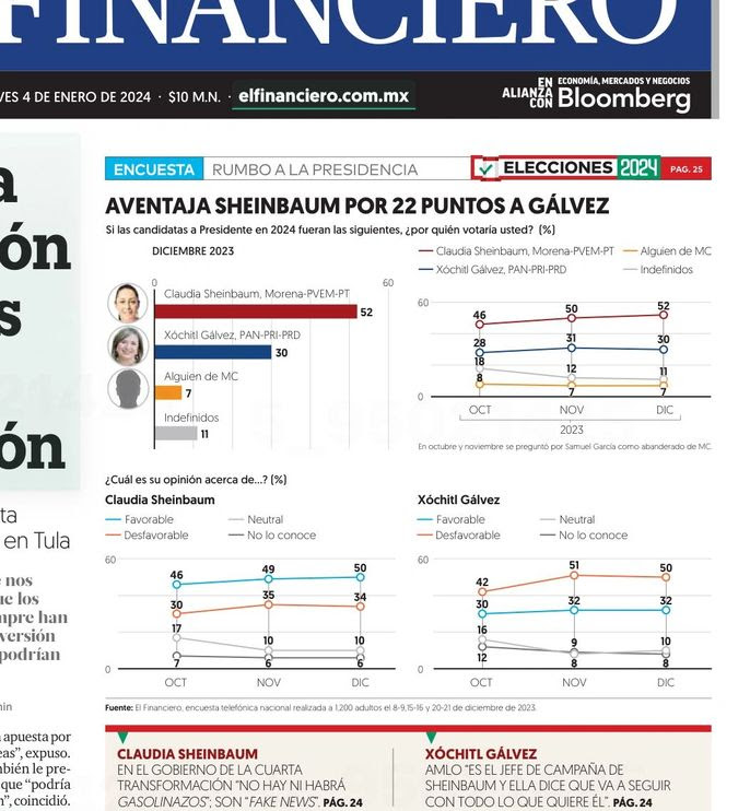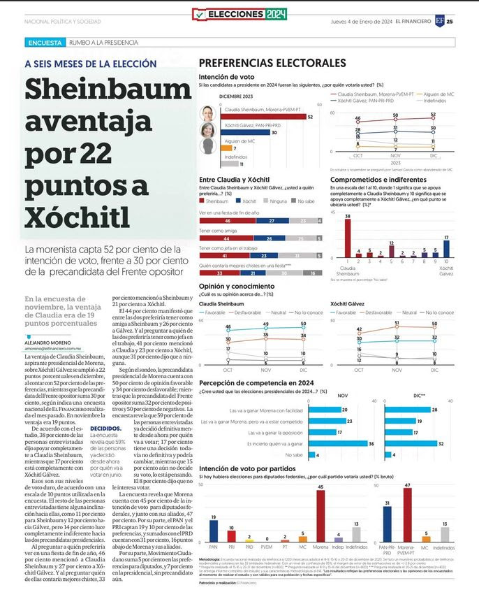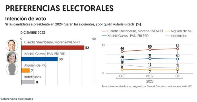 Ciudad de México. - La ventaja de Claudia Sheinbaum, aspirante presidencial de Morena, sobre Xóchitl Gálvez se amplió a 22 puntos porcentuales en diciembre, al contar con 52 por ciento de las preferencias, mientras que la precandidata del Frente opositor suma 30 por ciento, según indica una encuesta nacional de El Financiero realizada el mes pasado. En noviembre la ventaja era 19 puntos.