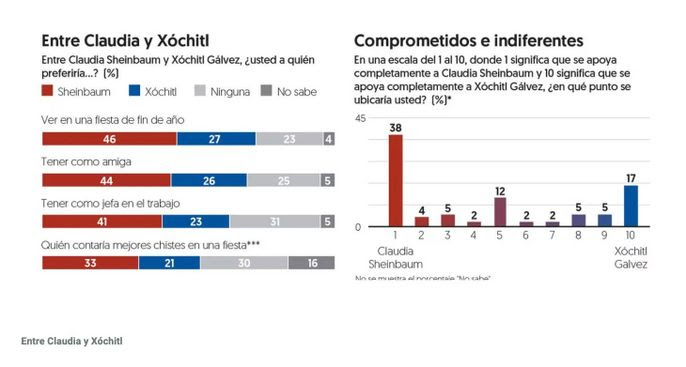 Al preguntar a quién preferiría ver en una fiesta de fin de año, 46 por ciento mencionó a Claudia Sheinbaum y 27 por ciento a Xóchitl Gálvez. Y al preguntar quién de ellas contaría mejores chistes, 33 por ciento mencionó a Sheinbaum y 21 por ciento a Xóchitl.