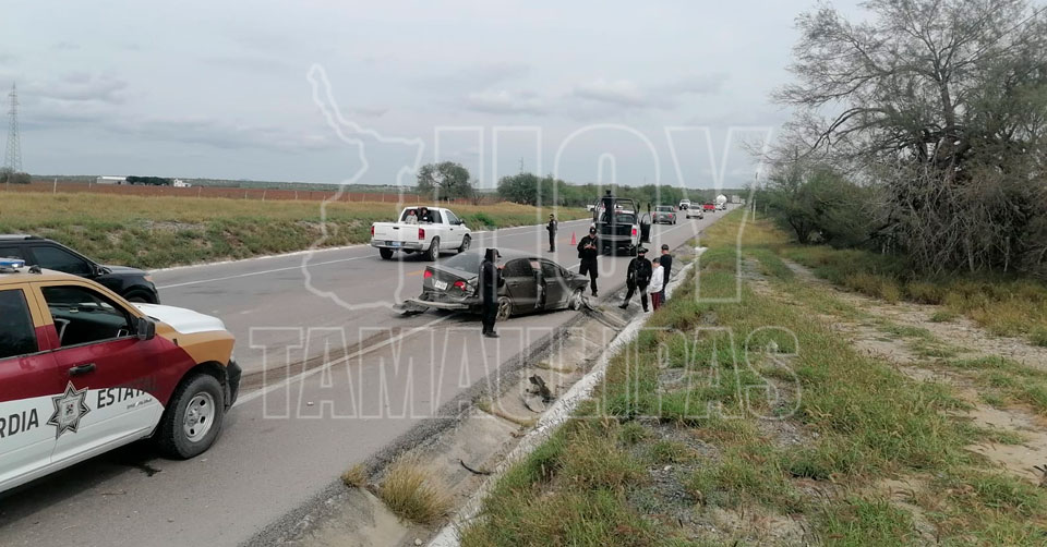 Jiménez, Tamaulipas. - Personal de Apoyo Carretero brinda seguridad vial en el kilómetro 124 de la Carretera Federal 101, luego de que un automovilista aparentemente perdió el control y derrapó.