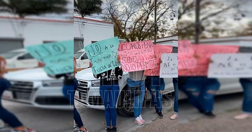 Reynosa, Tamaulipas. - Asociaciones defensoras de los derechos de los animales se manifestaron afuera de la Plaza de Toros Reynosa, en protesta por la reactivación de lo que se conoce como la fiesta brava, impulsada por el alcalde Carlos Peña Ortiz.