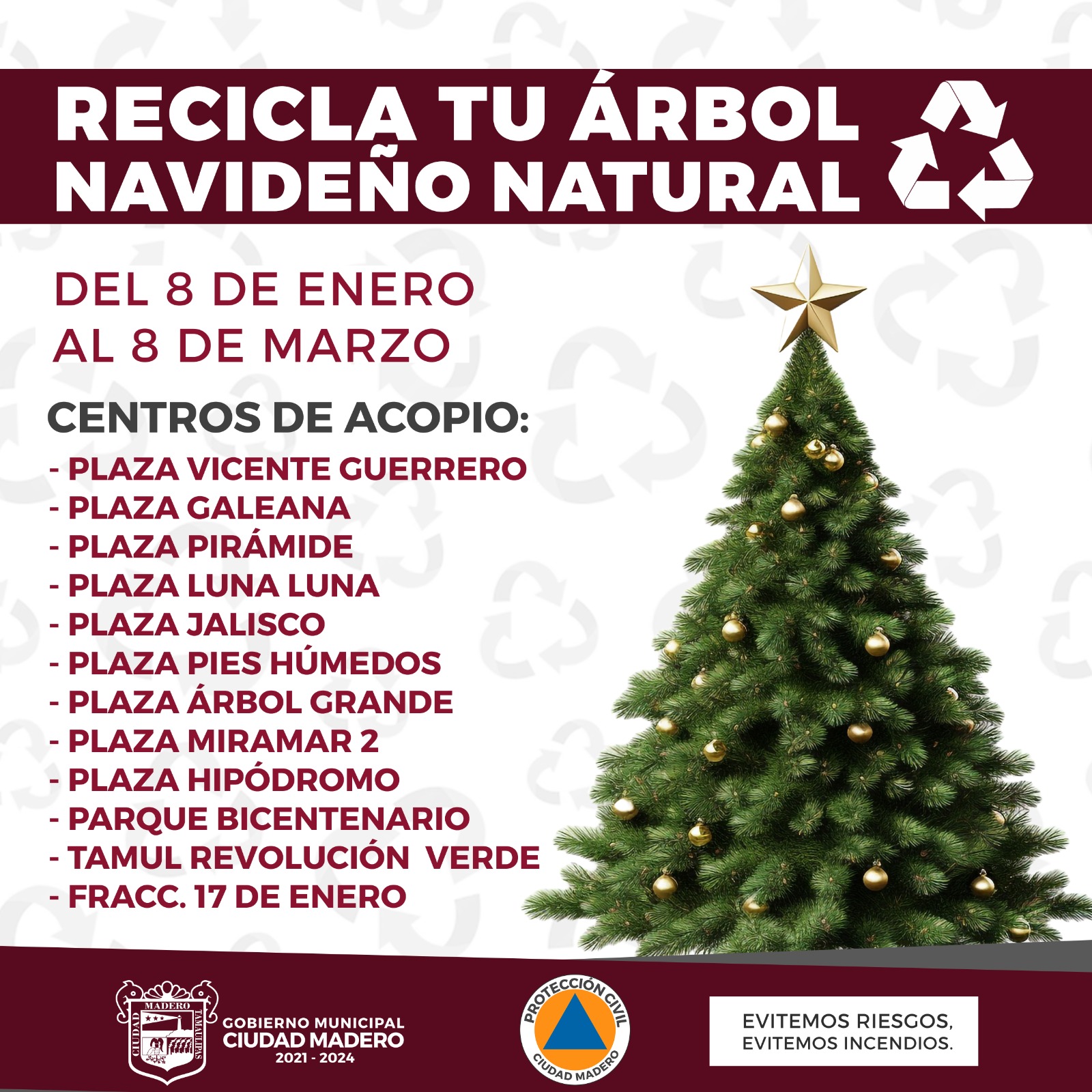 Ciudad Madero, Tamaulipas. - Para prevenir riesgos de incendio en los hogares y mantener las calles libres de acumulamiento, el Gobierno de Ciudad Madero invita a la población a desechar de manera correcta los pinos naturales, depositándolos en cualquiera de los centros de acopio que han sido instalados en distintos puntos de este municipio.