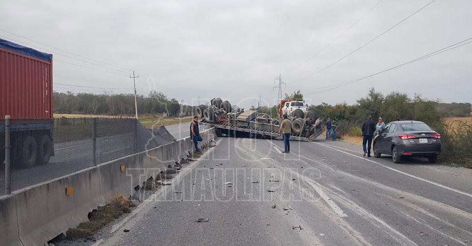 Mainero, Tamaulipas. – La carretera nacional Victoria-Monterrey se encuentra temporalmente cerrada a la circulación en los carriles de sur a norte, debido a la volcadura de una plataforma que transportaba camionetas nuevas.