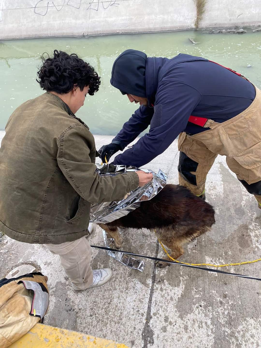Reynosa, Tamaulipas. - Elementos de Protección Civil rescataron un perro que se encontraba dentro de las aguas del dren de Las Mujeres, luego de una denuncia realizada en redes sociales.