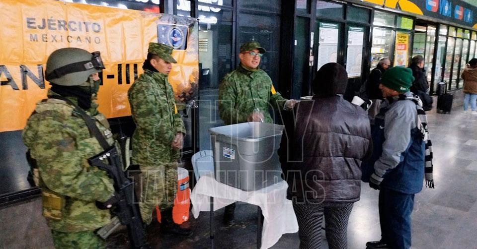 En la terminal de camiones se encontraban algunas personas en espera de su autobús y otros más que habían venido a despedir a un familiar, es así que de la misma forma los elementos del Ejército Mexicano les entregaban el pan y el café.