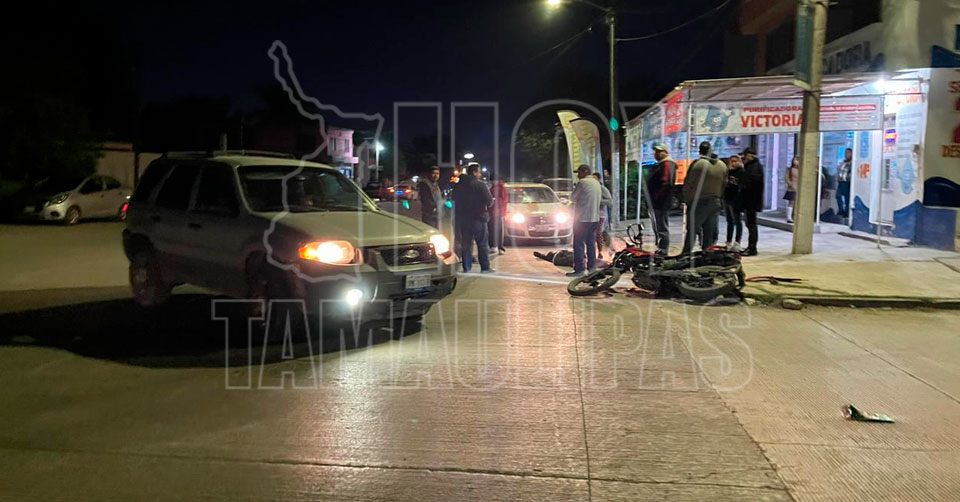 Ciudad Victoria, Tamaulipas. - Un conductor que presuntamente iba distraído con el celular y con las luces apagas provocó que un jovencito en moto se estrellara contra su camioneta, resultando con lesiones de consideración.