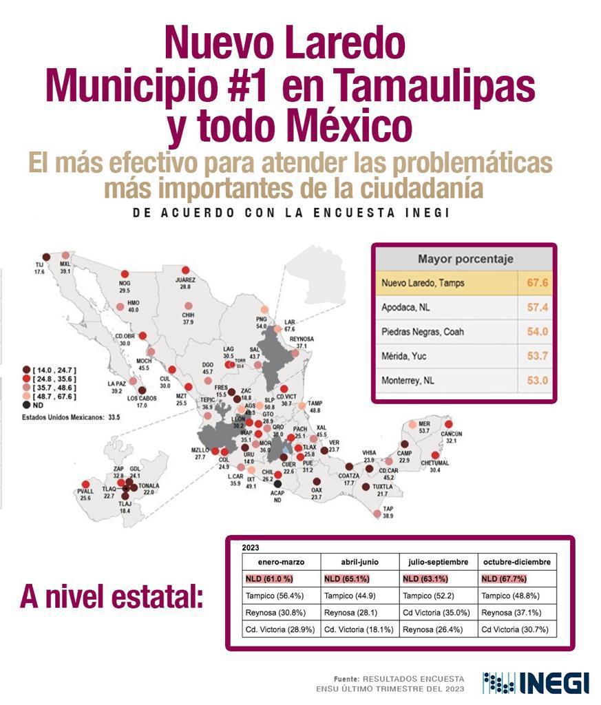 Cabe destacar, que Nuevo Laredo además de ser el primer lugar de gobiernos eficientes de todo México, es el único municipio de Tamaulipas que figura en el top 5 nacional del ENSU, dejando a atrás a ciudades como Tampico con un promedio de 48.8 por ciento, Reynosa con el 37.1 por ciento y más abajo Ciudad Victoria con el 30.7 por ciento.
