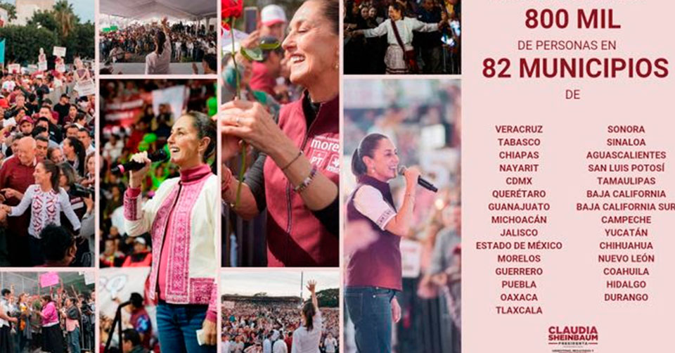 En nueve semanas, Sheinbaum Pardo recorrió México de norte a sur, encontrándose con 800 mil 60 personas de 82 municipios de diversos puntos de la República Mexicana a quienes llevó un mensaje a favor de la continuidad de la transformación, la cual también significa que en el país llegó el momento para que las mujeres sean quienes lideren la siguiente etapa histórica de la nación.