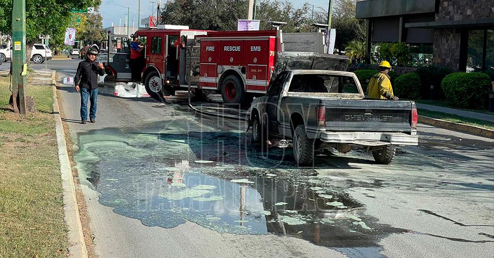 Ciudad Victoria, Tamaulipas. - Un corto circuito en el sistema eléctrico de una camioneta desató un voraz incendio que terminó por reducirla a cenizas esta tarde, en el 8 y 9 Bulevar Adolfo López Mateos.