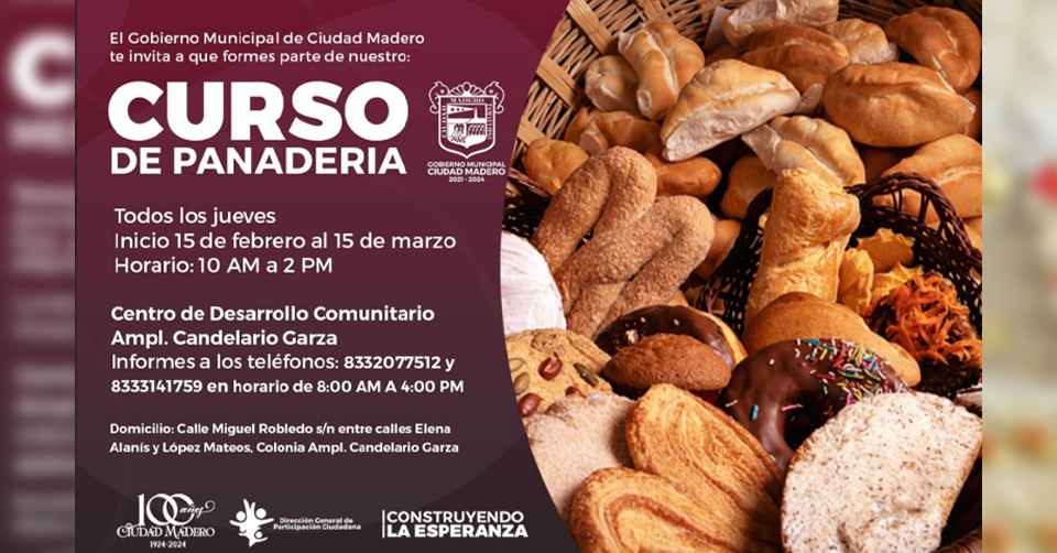 También, del 15 de febrero al 15 de marzo se impartirá el curso de panadería en horario de 10:00 a 14:00 horas, todos los jueves.