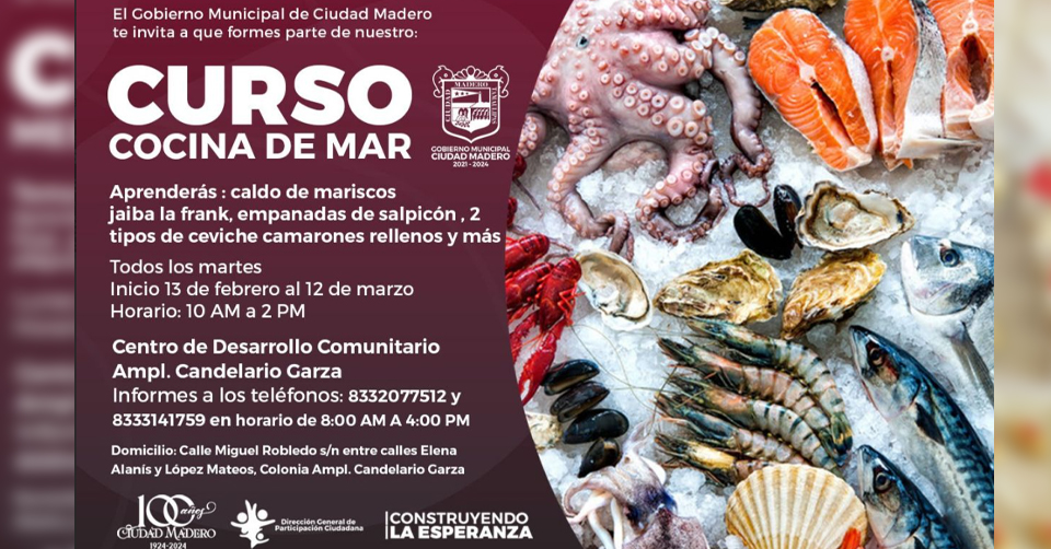 Asimismo, se llevará a cabo un taller de cocina de mar, el cual empezará el 13 de febrero en horario de 10:00 a 14:00 horas, en el que se prepararán platillos como: caldo de mariscos, jaiba a la Frank, empanadas de salpicón, 2 tipos de ceviche, camarones rellenos, entre otros.