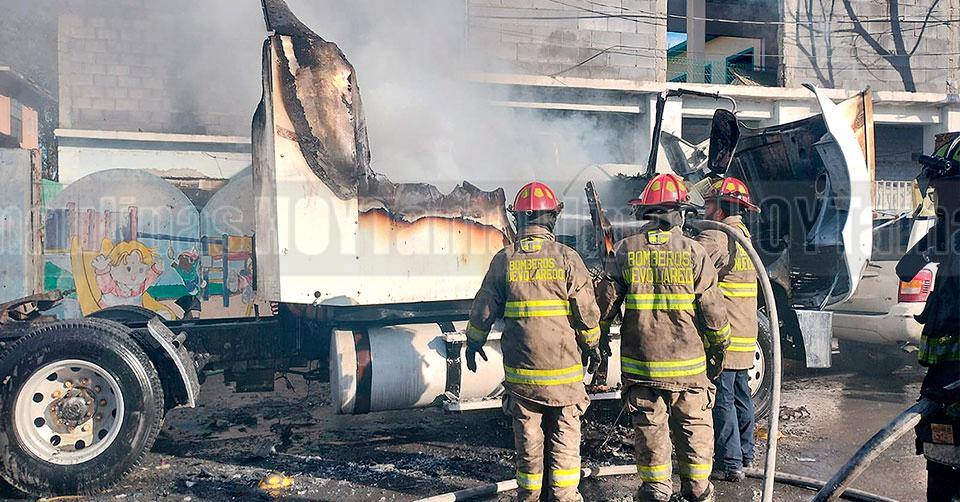 Nuevo Laredo, Tamaulipas. - Un tráiler quedó totalmente calcinado luego de que se produjo un cortocircuito al encenderlo, en un taller mecánico ubicado en la colonia Hidalgo de Nuevo Laredo.