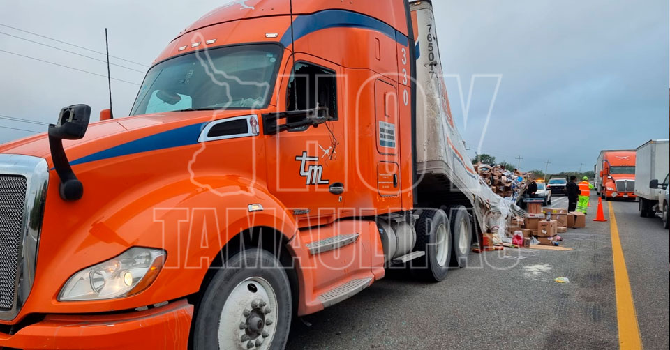 González, Tamaulipas. - Un tráiler que transportaba víveres chocó esta mañana con otra pesada unidad, lo que provocó que la caja se averiara y se tirara la mercancía.