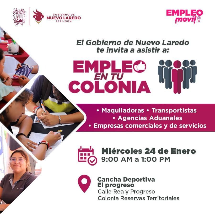 Nuevo Laredo, Tamaulipas.-El Gobierno Municipal invita a la ciudadanía a acudir al evento “Empleo en tu colonia” que se realizará este miércoles 24 de enero en las canchas deportivas El Progreso, ubicadas en Bulevar Rea entre Tebas y Progreso Oriente en contra esquina de la Secundaria 80.