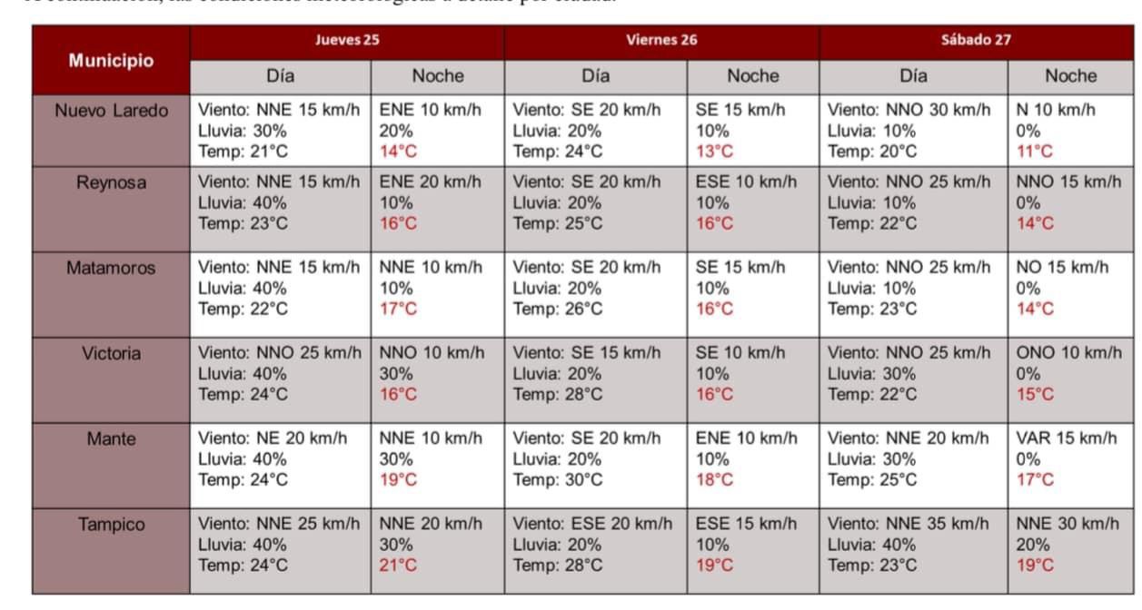 Además, se espera evento "Norte" débil con ráfagas de viento de 25-45 km/h y velocidades de 45-65 km/h en Golfo de México y ligero descenso térmico.