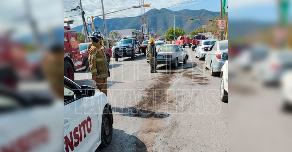 Intervienen bomberos por aceite derramado tras choque en Victoria