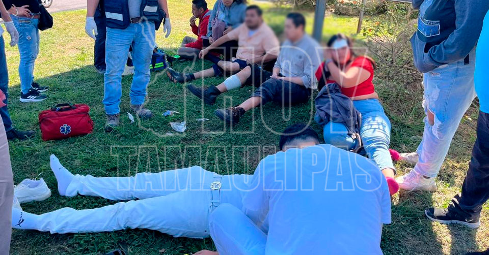 El vehículo en mención se impactó en la parte posterior de un carro Chevrolet Cruze color rojo guiado por el joven Juan Carlos, de 18 años, resultando en el percance lesionados, además los pasajeros del vehículo de transporte, Juan Pablo, de 32 años; José Manuel de 45 y Carla Judith de 17, a quienes brigadistas de la agrupación Bomberos Voluntarios de Tamaulipas les dieron atención mientras personal de la Cruz Roja llegaba en apoyo.