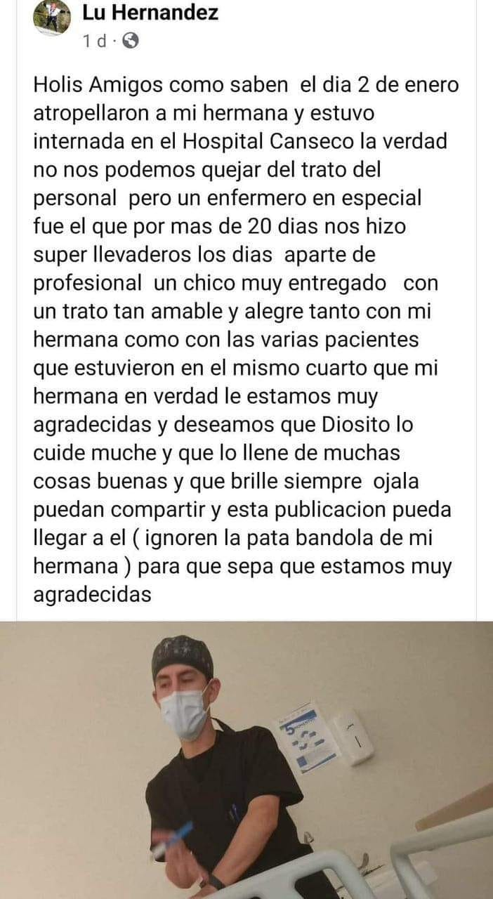 "La verdad no nos podemos quejar del trato del personal, pero un enfermero en especial, fue el que por más de 20 días nos hizo súper llevaderos los días aparte de profesional, un chico muy entregado con un trato tan amable y alegre tanto con mi hermana como con las varias pacientes que estuvieron en el mismo cuarto que mi hermana", relató.