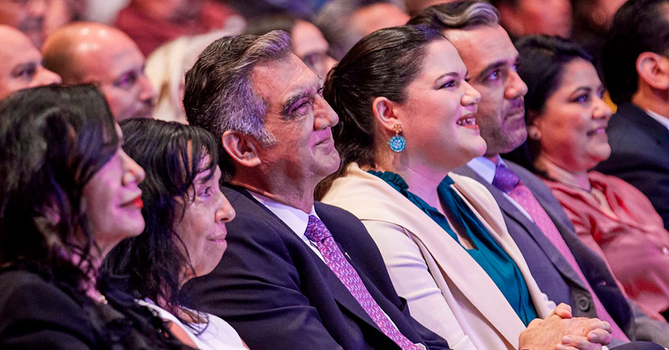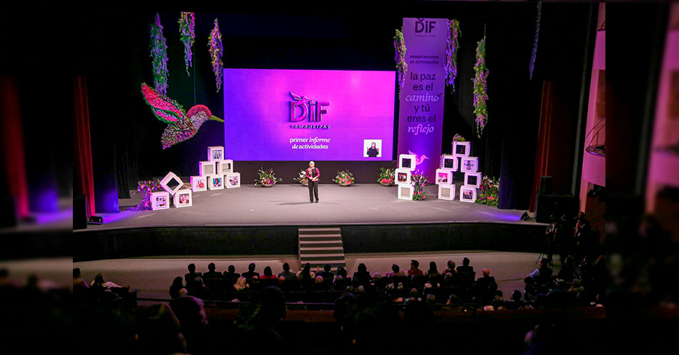 Ciudad Victoria, Tamaulipas. - Teniendo como marco el Teatro Amalia González Caballero de Castillo Ledón de esta ciudad, y acompañada de su esposo el doctor Américo Villarreal Anaya, gobernador del estado, la doctora María de Villarreal, presidenta del Sistema DIF Tamaulipas, presentó su primer informe de actividades al frente de esa institución, con el lema “La paz es el camino, y tú eres el reflejo”.