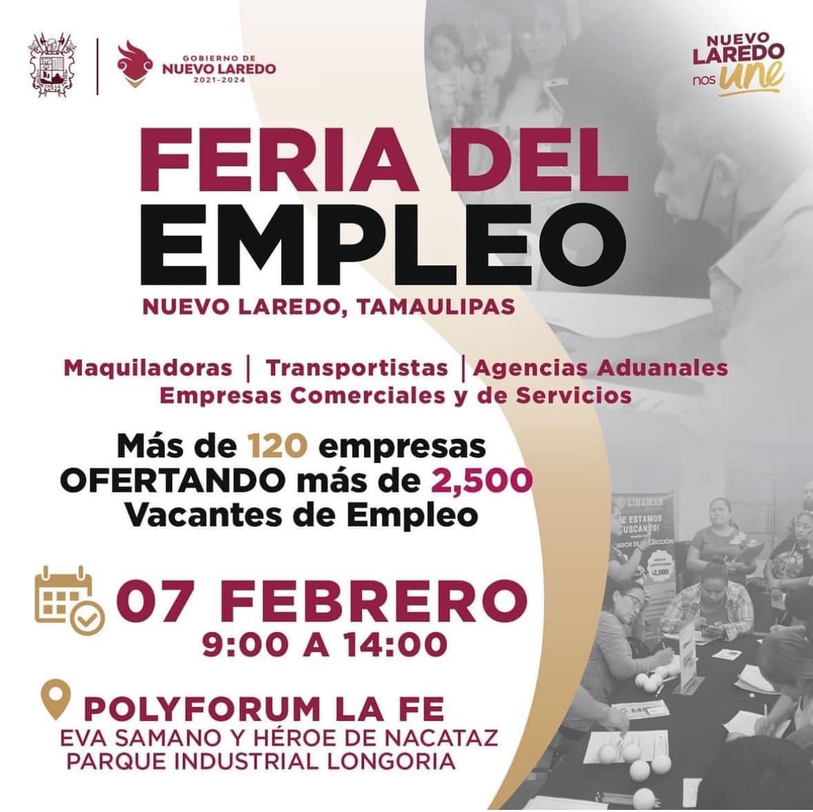Nuevo Laredo, Tamaulipas.- El Gobierno Municipal a través de la Secretaría de Desarrollo Económico, anunció la primera Feria del Empleo 2024 que se realizará este 7 de febrero en horario de las 9:00 AM a las 14:00 PM en el Polyforum La Fe.