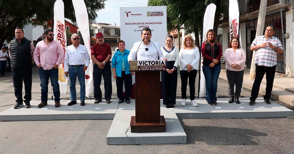 Ciudad Victoria, Tamaulipas. - El alcalde Eduardo Gattás Báez y Lucy de Gattás se reunieron con familias del fraccionamiento Las Flores para cumplir con el compromiso de inaugurar 3,489 metros cuadrados de pavimento asfáltico en la calle Pirul, una vialidad que esperó más de 40 años para ser rehabilitada.