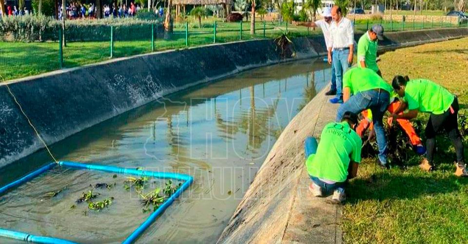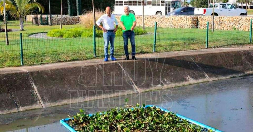 Tampico, Tamaulipas. - El Ayuntamiento de Tampico, a través de un innovador mecanismo de recuperación de los cuerpos de agua, sembró lirio acuático en uno de los drenes a cielo abierto que regularmente transporta aguas negras desde la zona más alta del sector, mismo que desemboca en la Laguna del Carpintero, con el objetivo de purificarlo, declaró el secretario de Servicios Públicos Municipales, Pepe Schekaibán.