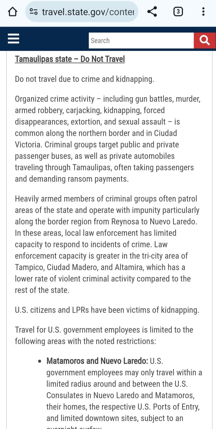 A través de su embajada en Matamoros, Tamaulipas, el gobierno estadounidense asegura que la actividad de grupos de la delincuencia, incluidos tiroteos, asesinatos, robos a mano armada, robos de vehículos, secuestros, desapariciones forzadas, extorsiones y agresiones sexuales, están a la orden del día.