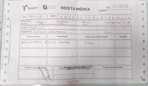 El paciente Jesús Gallegos Sánchez necesita recibir diálisis marca Baxter 1.5, sin embargo, sus hermanas, quienes son las que se encargan de él, trabajan al día y los gastos la superan.