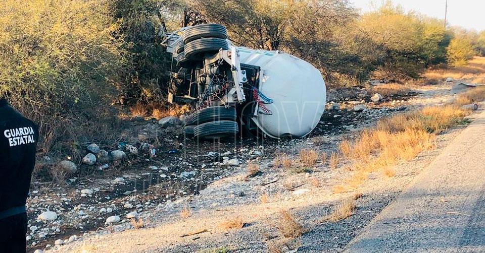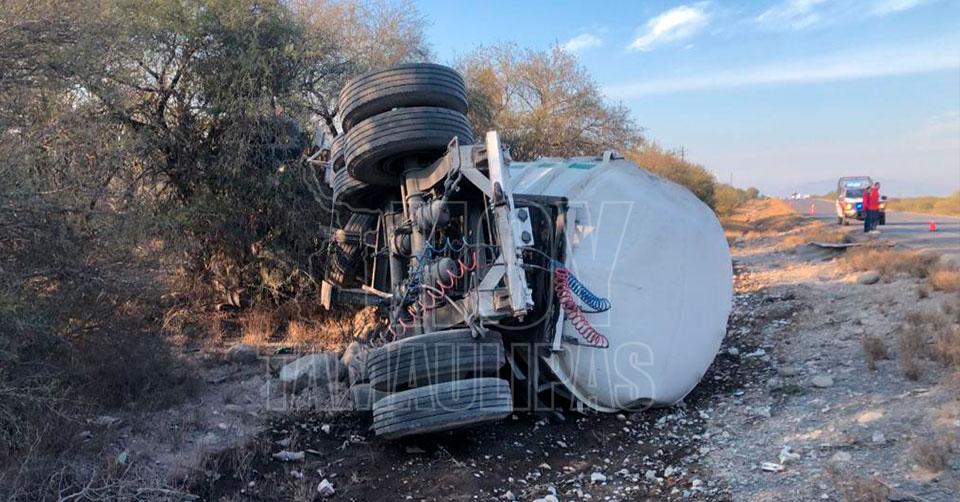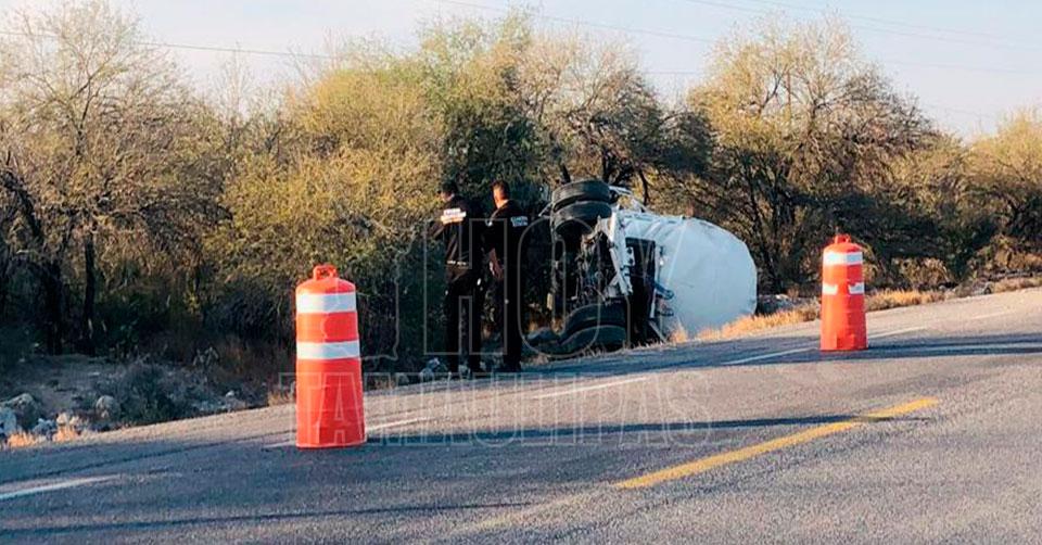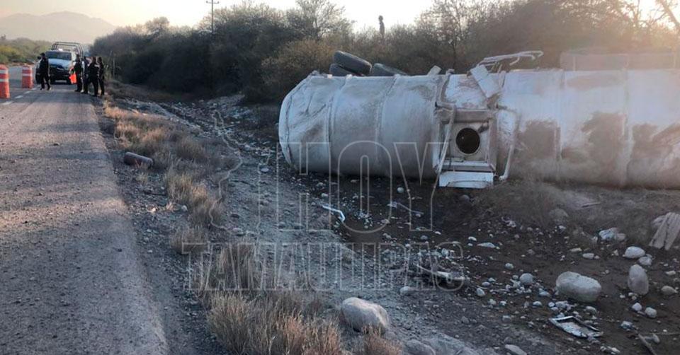 Jaumave, Tamaulipas. – Un autotanque que transportaba gasolina volcó tras desprenderse del primer cilindro en el kilómetro 118 de la Carretera Federal 101, como referencia a 400 metros antes de llegar al retén militar de Jaumave.
