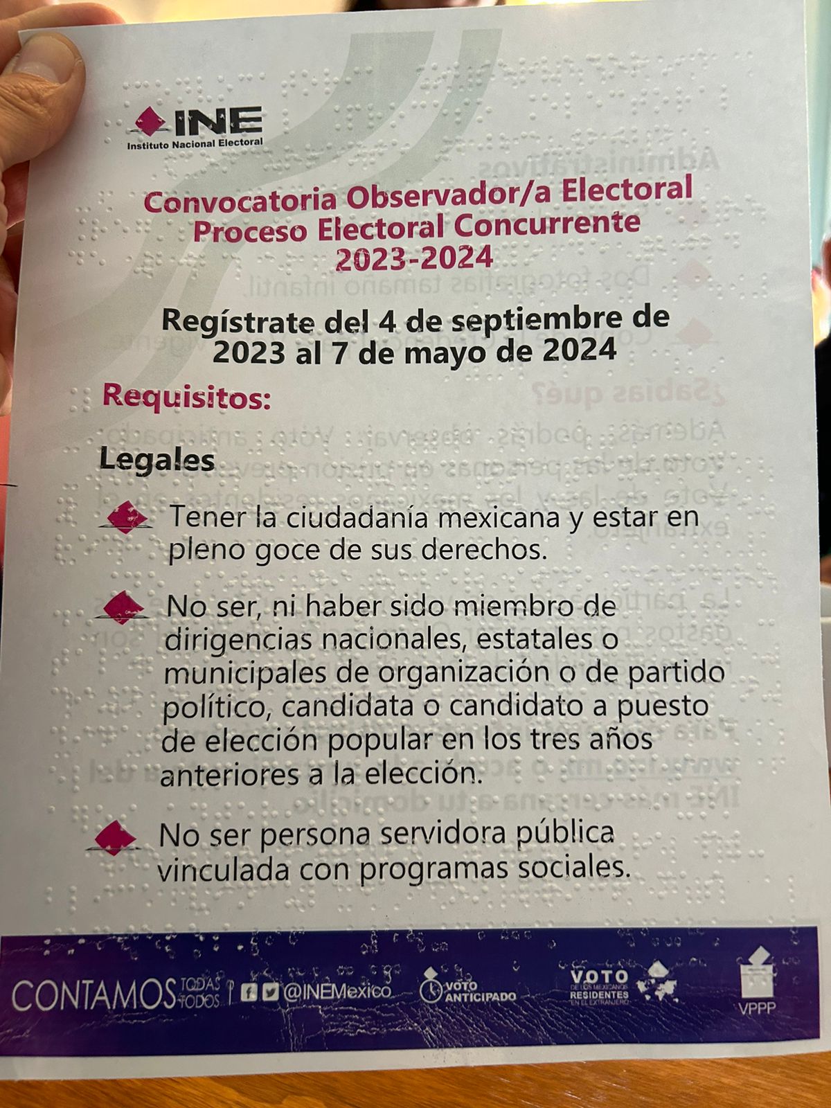 Lanza INE convocatoria en braille para observadores electorales
