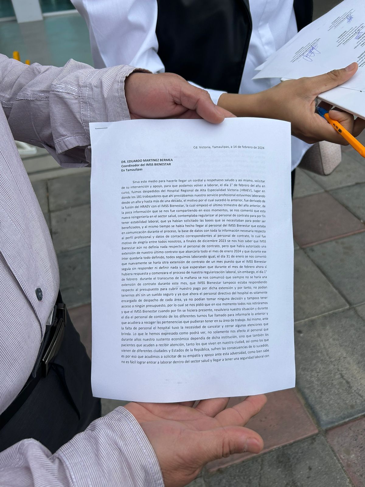 El ex trabador del área de inhaloterapia, acudió con un grupo de ex compañeros del HRAE a la Torre Bicentenario, donde se entrevistaron con Martínez Berma, al cual le entregaron un oficio, donde entre otros aspectos, le plantean la recontratación de sus funciones y la necesidad de poner orden administrativamente en la institución de salud, que forma parte del OPD IMSS Bienestar.