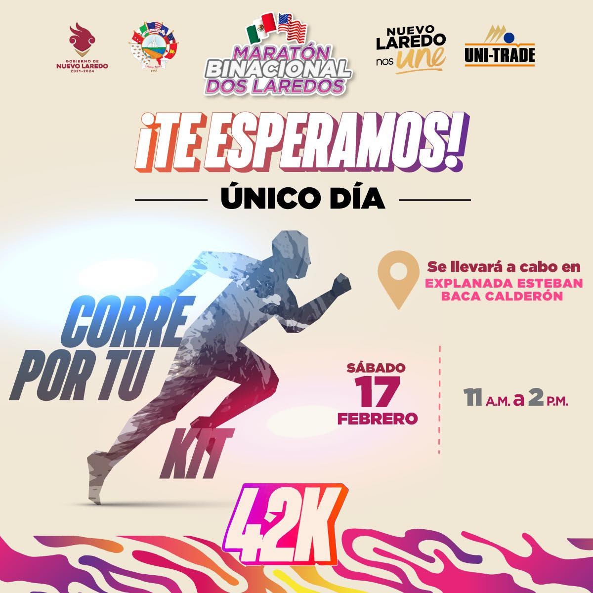 Nuevo Laredo, Tamaulipas.-Los organizadores del histórico maratón Binacional Dos Laredos, reportan que todo se encuentra listo para llevarse a cabo e invitan a los corredores inscritos, a pasar a recoger su kit de participación este sábado 17 de febrero en la Explanada Esteban Baca Calderón en horario de las 11:00 AM a las 2:00 PM.