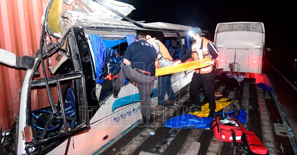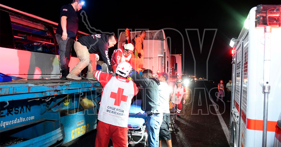 Ciudad Victoria, Tamaulipas. – Una mujer sin vida y nueve pasajeros lesionados, entre ellos un menor y un adulto graves fue el saldo que arrojó el choque entre un autobús de turismo y un tráiler esta madrugada, en el kilómetro 45 de la carretera Zaragoza-Victoria.
