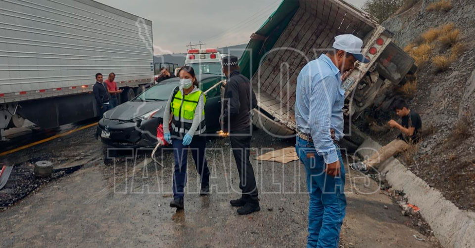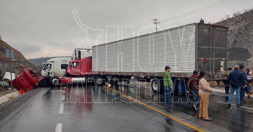 Jaumave, Tamaulipas. - Resultado de un choque entre dos tráileres y dos vehículos, la circulación se encuentra cerrada en ambos sentidos en la Carretera Federal 101 a la altura del municipio de Jaumave.