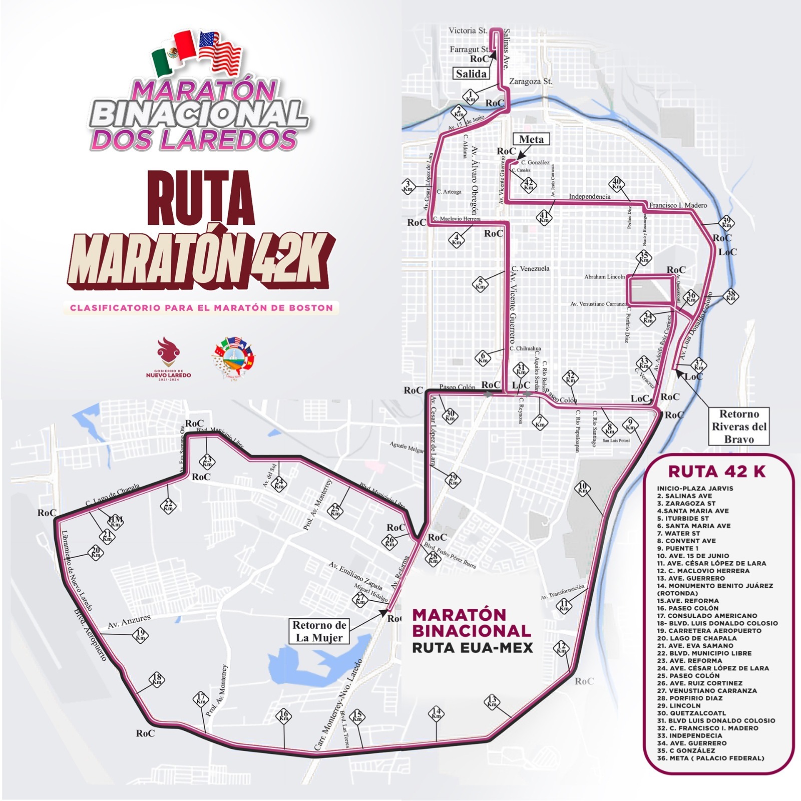 Los corredores de este evento único en el mundo debido a que recorre dos países, saldrán de la Plaza Jarvis de Laredo, Texas, para de allí enfilar hacia el Puente Internacional I y cruzar hacia Nuevo Laredo y de inmediato dirigirse al Bulevar 15 de Junio y posteriormente tomar César López de Lara.