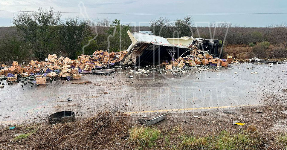 Nuevo Laredo, Tamaulipas. — Un accidente entre dos tráileres, uno de ellos cargado con toneladas de aguacate, se registró este sábado por la mañana en el Libramiento Mex 2 de Nuevo Laredo, en un tramo que además de inconcluso, ha sido escenario de varias tragedias.