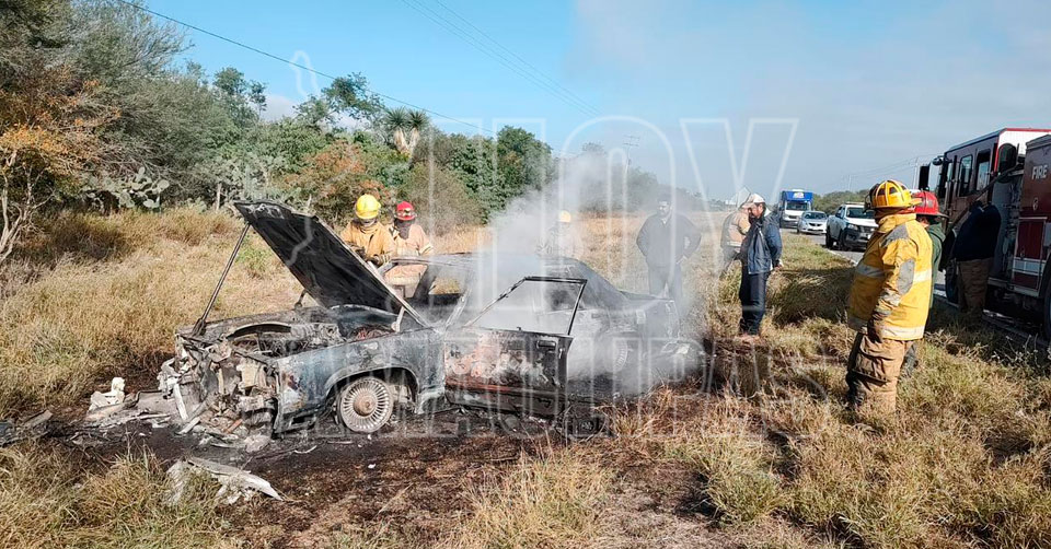 Ciudad Victoria, Tamaulipas. – Un auto Ford Grand Marquis terminó reducido a cenizas esta mañana, luego de sufrir un corto circuito cuando era conducido por la carretera antigua a El Mante, a unos metros del entronque con la carretera Rumbo Nuevo.