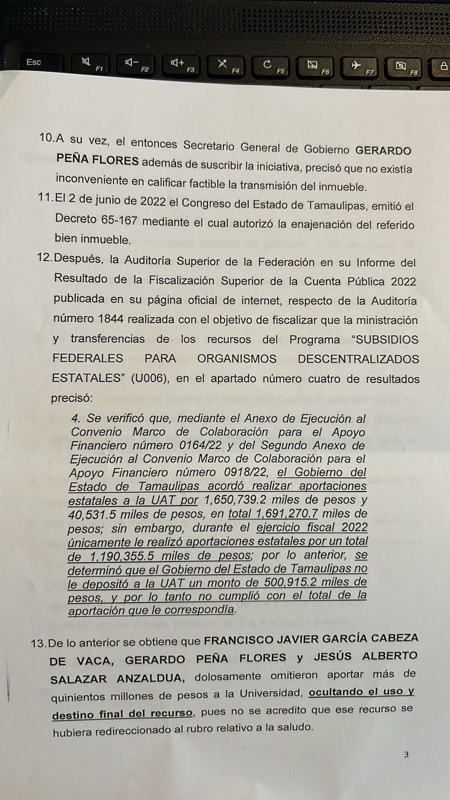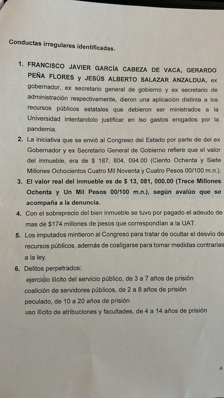 En la denuncia, además está involucrado el actual diputado federal Gerardo Peña Flores, Jesús Alberto Salazar Anzaldúa y Guillermo Mendoza Cavazos, los dos primeros altos ex funcionarios de la administración cabecista, y el tercero ex rector de la máxima casa de estudios en Tamaulipas.