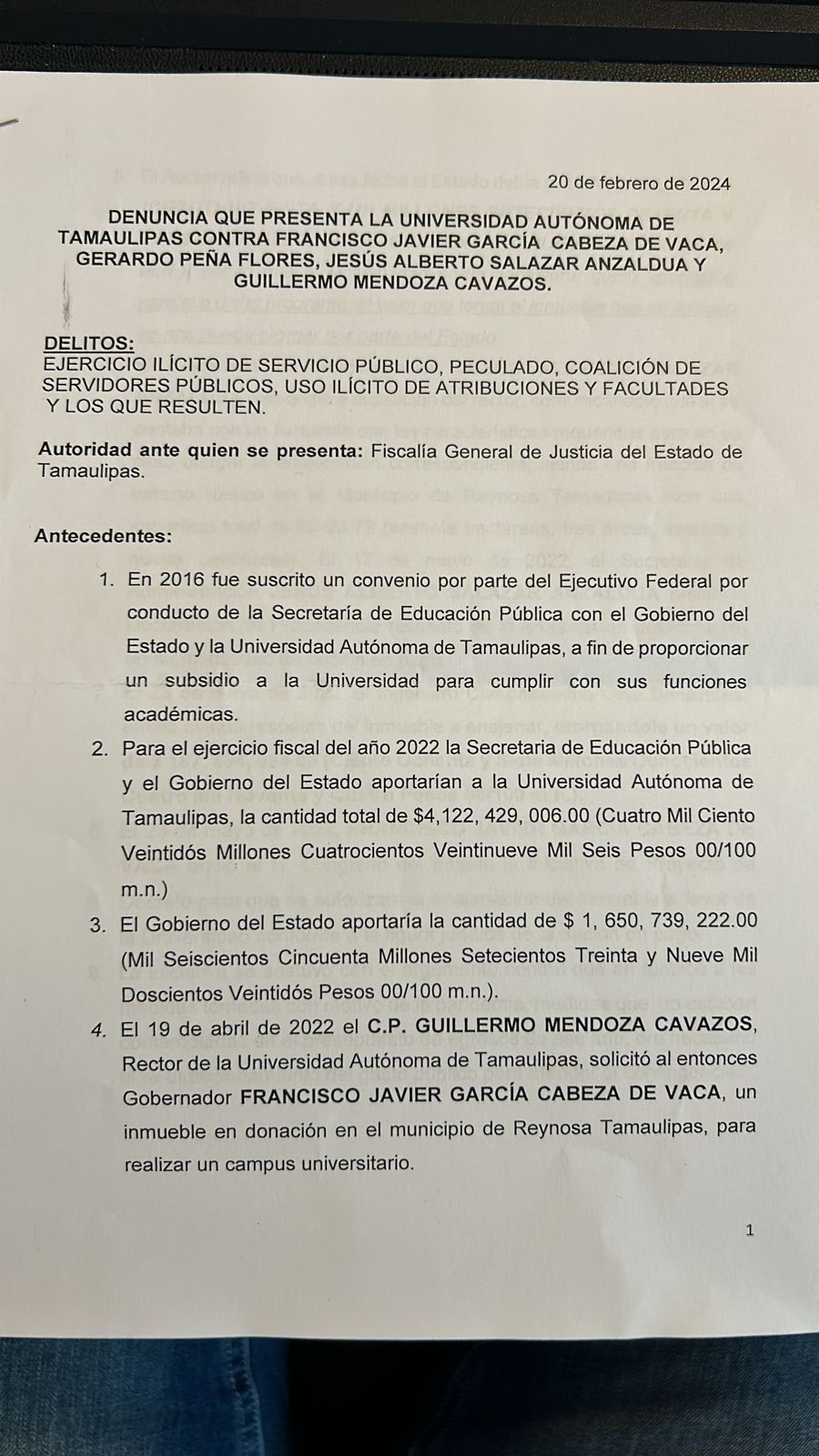 Ciudad Victoria, Tamaulipas. - El abogado general de la Universidad Autónoma de Tamaulipas (UAT), José Carlos Mora García, informó en rueda de prensa que fue presentada una denuncia ante la Fiscalía General de Justicia (FGJ) del Estado, en contra del ex mandatario Francisco García Cabeza de Vaca y del ex rector, Guillermo Mendoza Cavazos por los delitos de ejercicio ilícito de servicio público, peculado, coalición de servidores públicos, uso ilícito de atribuciones y facultades.