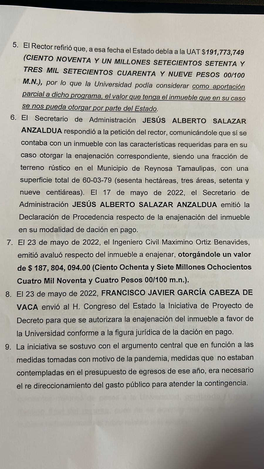 “Derivado del proceso entrega-recepción y, en consecuencia de este proceso se han encontrado una serie de inconsistencias graves que afectan el patrimonio de la Universidad Autónoma de Tamaulipas, en un orden de 180 millones de pesos”