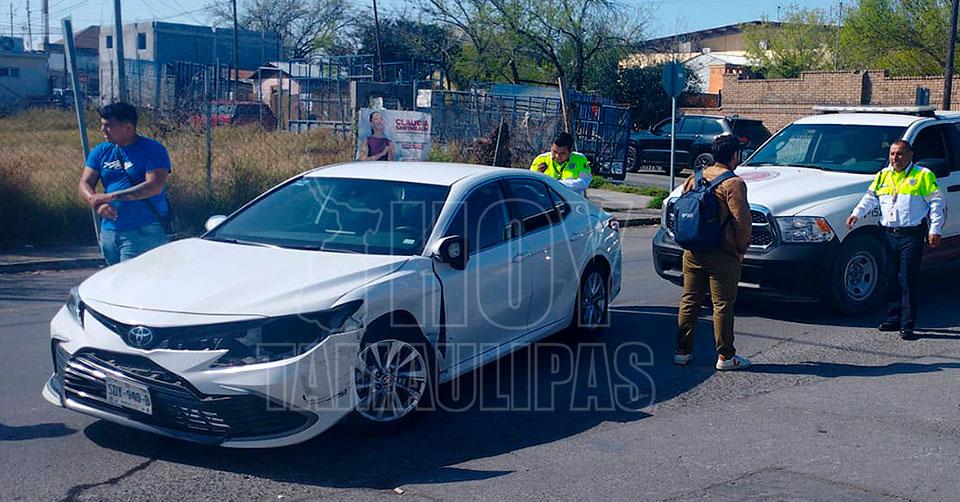 Nuevo Laredo, Tamaulipas. - Un conductor neolonés que cambió de carril sin precaución provocó un choque entre su Toyota Camry y un Ford Fusión, que terminó impactándose contra el poste de un anuncio de una tienda de conveniencia en el sector centro de Nuevo Laredo.