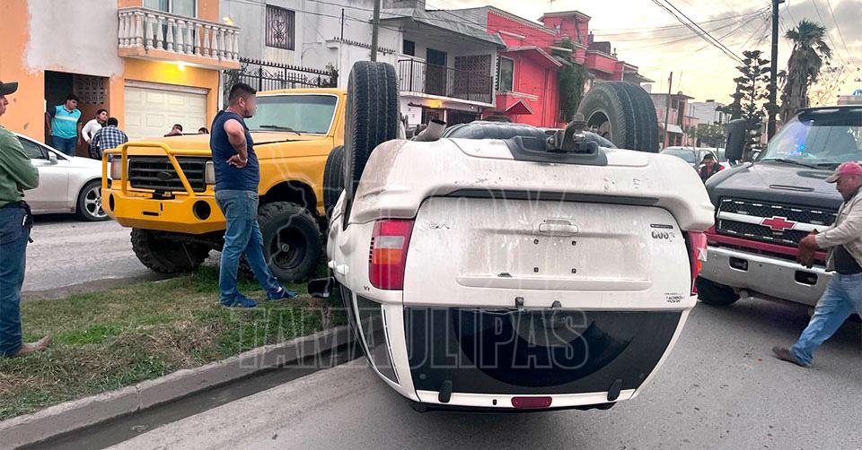 Matamoros, Tamaulipas. - El conductor de una camioneta Jeep Cherokee 4x4 volcó esta tarde en la Avenida Cantinflas en Matamoros, al perder el control de la unidad y terminar impactado contra una Ford Bronco estacionada en la zona.
