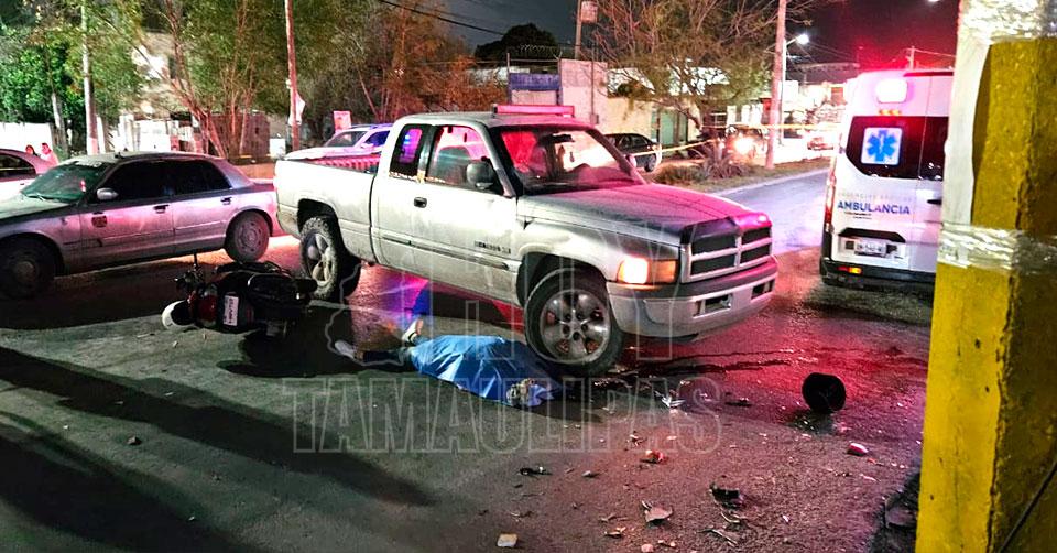 Reynosa, Tamaulipas. - Una mujer perdió la vida trágicamente esta noche al estrellar la moto en la que viajaba con una amiga, contra una camioneta que presuntamente se atravesó al paso, en el Boulevard Mil Cumbres y Avenida Sur 1 de Reynosa.