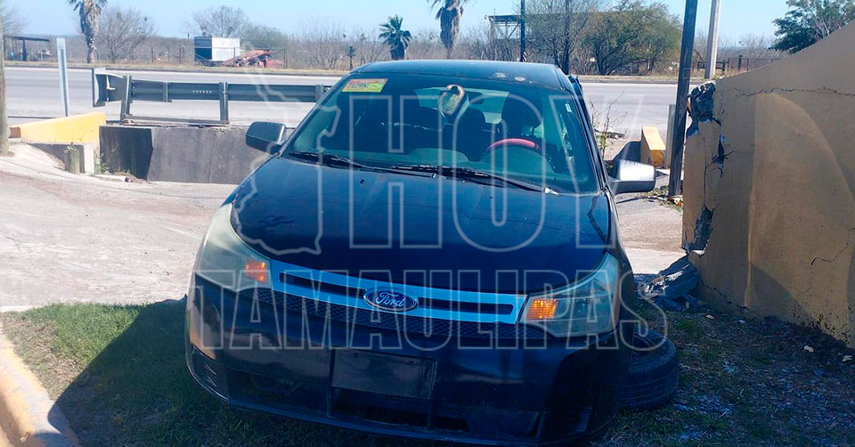 Nuevo Laredo, Tamaulipas.— Una joven de 15 años provocó un accidente al perder el control de su auto y chocar contra la pared de concreto de una figura que se encuentra en la entrada a la colonia Valle Dorado, en la Carretera Nacional de Nuevo Laredo.