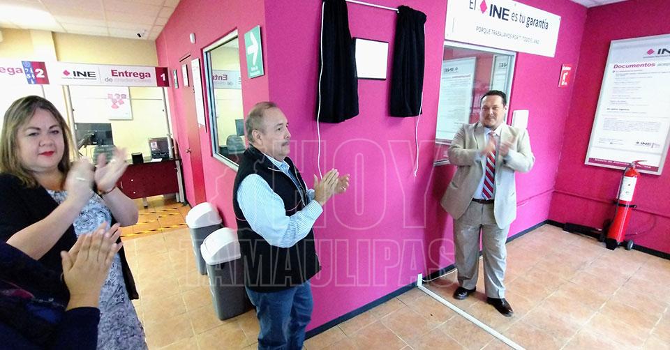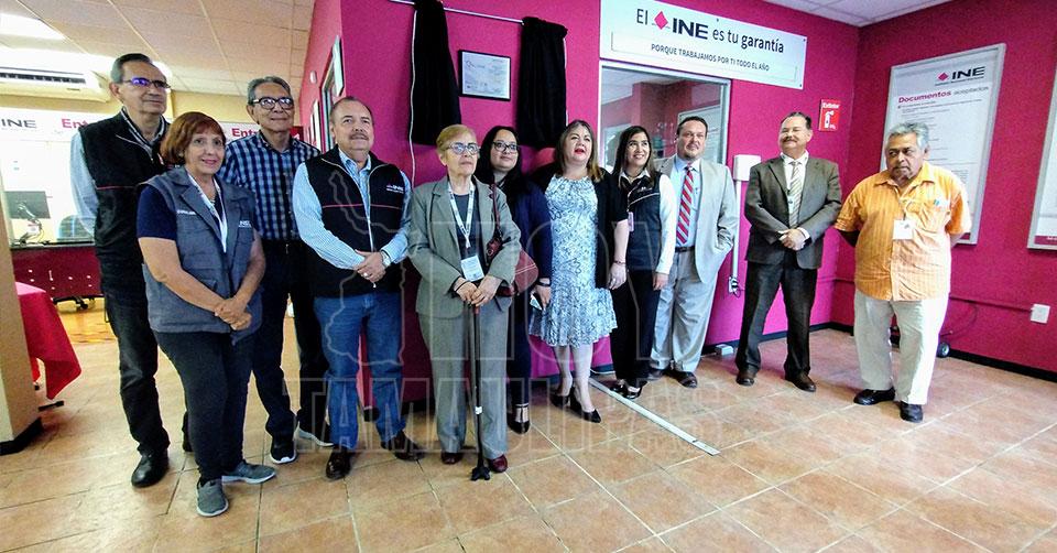 Enseguida, los funcionarios federales del INE develaron la placa que fue instalada en el interior del recinto público justo en el espacio que sirve de antesala a los ciudadanos que acuden a solicitar la credencial de elector.