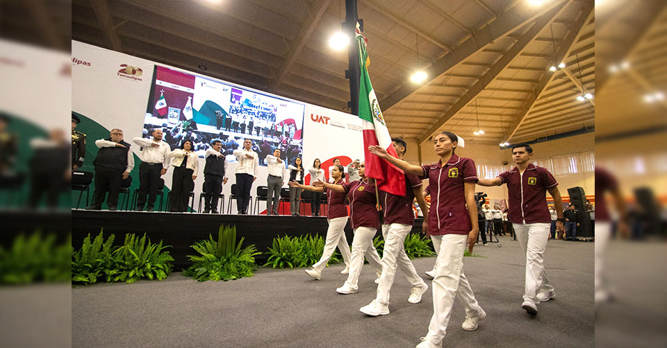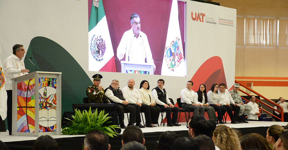Acompañado del MVZ Dámaso Leonardo Anaya Alvarado, rector de la UAT, el gobernador expresó su mensaje en la ceremonia cívica de honores a la bandera nacional en las instalaciones del Gimnasio Multidisciplinario del Centro Universitario de Victoria.