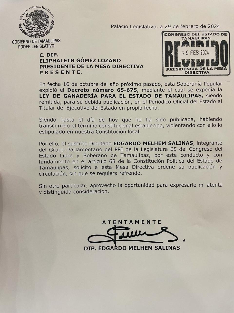 Ciudad Victoria, Tamaulipas. - El diputado Edgardo Melhem Salinas exigió a la presidencia de la mesa directiva del Congreso del Estado que ordene la publicación y distribución de la Ley Ganadera aprobada en octubre de 2023.