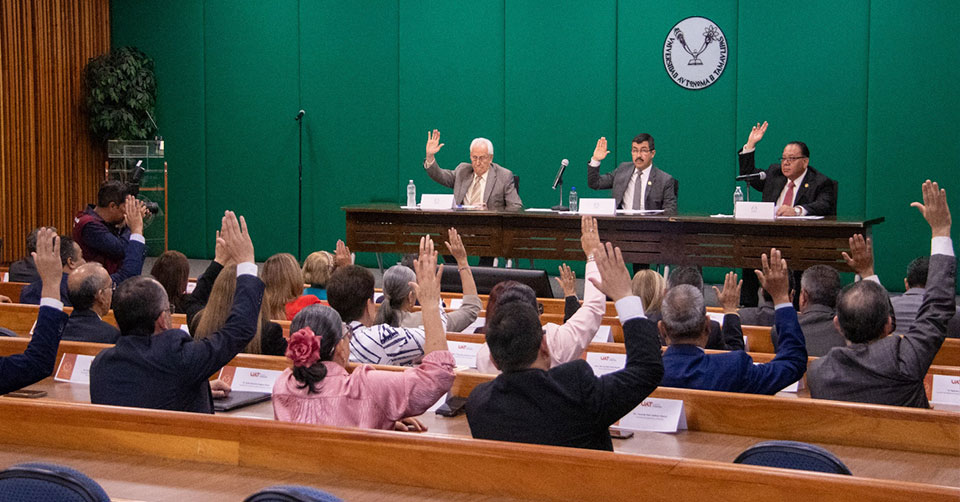 Ciudad Victoria, Tamaulipas. - El rector de la Universidad Autónoma de Tamaulipas (UAT) MVZ Dámaso Leonardo Anaya Alvarado, presidió la sesión de Asamblea Extraordinaria en la cual los integrantes del máximo órgano colegiado universitario aprobaron la creación de dos nuevos programas de licenciatura y la apertura de nuevas sedes hospitalarias para programas académicos de posgrado.