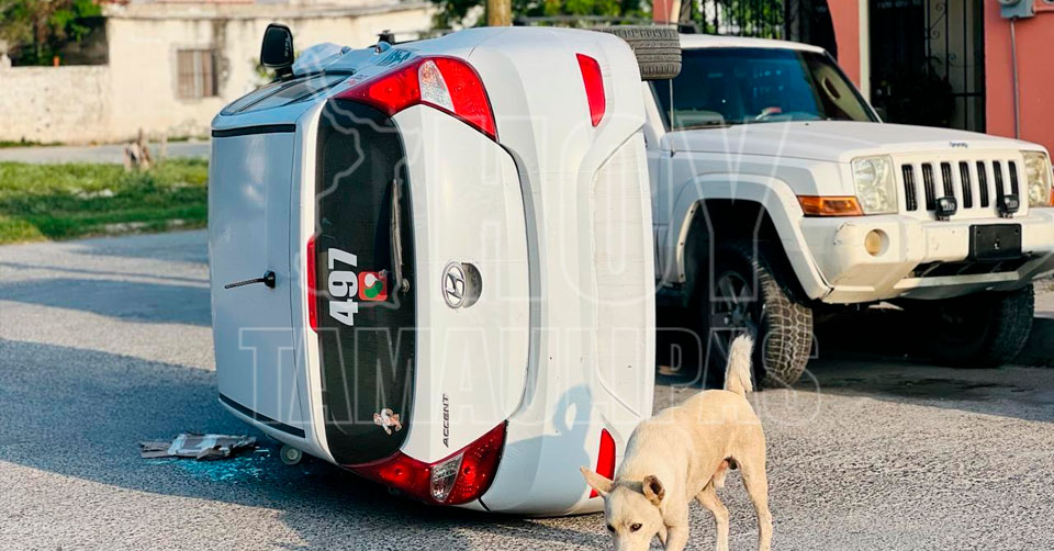 Matamoros, Tamaulipas. - Un choque con volcadura ocurrió esta mañana al interior de la colonia Las Águilas en Matamoros, cuando un taxista de la base Soriana perdió el control de su unidad en la calle Central.
