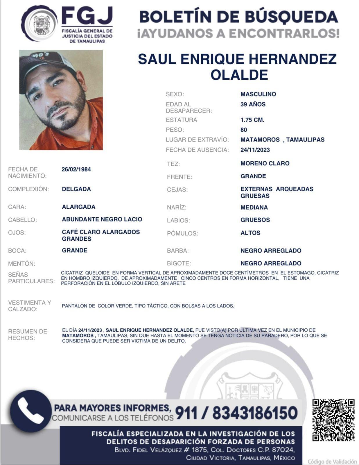 Matamoros, Tamaulipas. – Con poco más de 3 meses desaparecido en Matamoros, el hermano de Saúl Enrique Hernández Olalde no pierde las esperanzas de encontrarlo y que pueda despedirse de su madre, quien padece cáncer terminal.