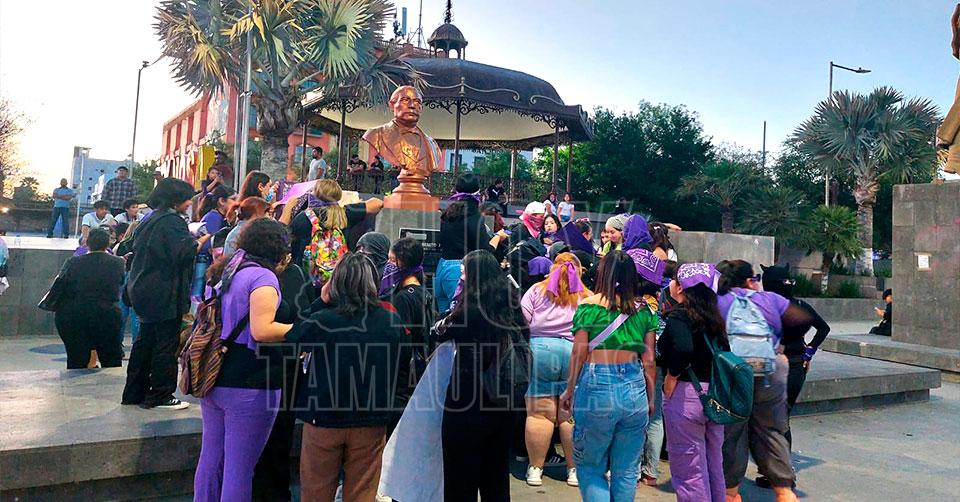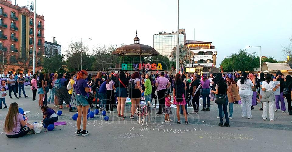 Reynosa, Tamaulipas. - Un centenar de mujeres, pertenecientes a diversos colectivos feministas, realizaron este viernes una manifestación en Reynosa con motivo de la conmemoración del Día Internacional de la Mujer.